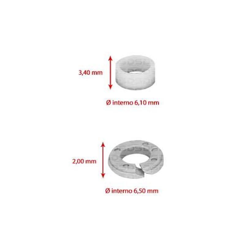 O'rings: 04 | Ø Interno (mm): 5,94 | Ø Secção (mm): 3,53 | Anéis: 04 | Ø Interno (mm): 6,10 | Altura (mm): 3,40 | Anel Espaçador: 04 | Ø Interno (mm): 6,50 | Altura (mm): 2,00 | Obs: Lubrifique os anéis o-rings com óleo para motor isento de silicone antes de instalar.